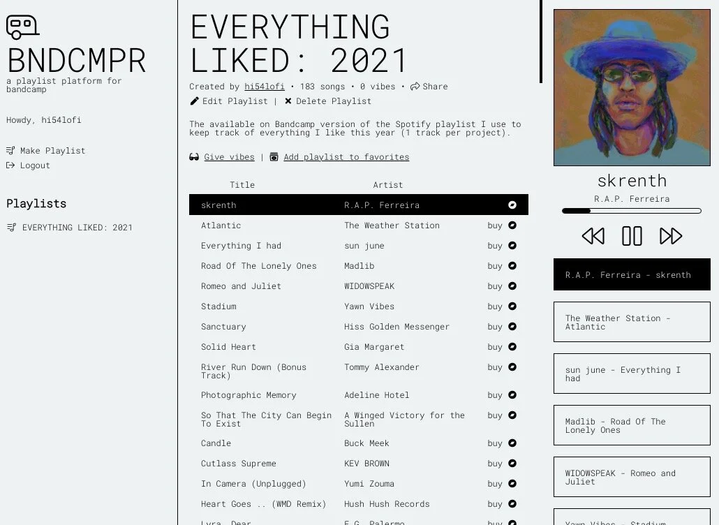 And since Spotify/streaming is great for discovering, sharing & keeping track of music but not so very good in the way creators are paid for their work, especially in comparison to what others are making off renting out access to their work, I’ve started keeping a Buy Music Club list going for all the ‘available on Bandcamp’ tracks that get added to the above Spotify playlist + I’ve also started a BNDCMPR playlist that you can listen to like a Spotify playlist, except all the tracks are linked to the artist’s Bandcamp page— so check those out whenever you find yourself wanting to reward your ears while also directly sending out support/compensation to those who help keep our lives nicely soundtracked (and here’s an article on the topic of making streaming better/fairer if interested, because there’s no good reason why we can’t be doing better with all this stuff).