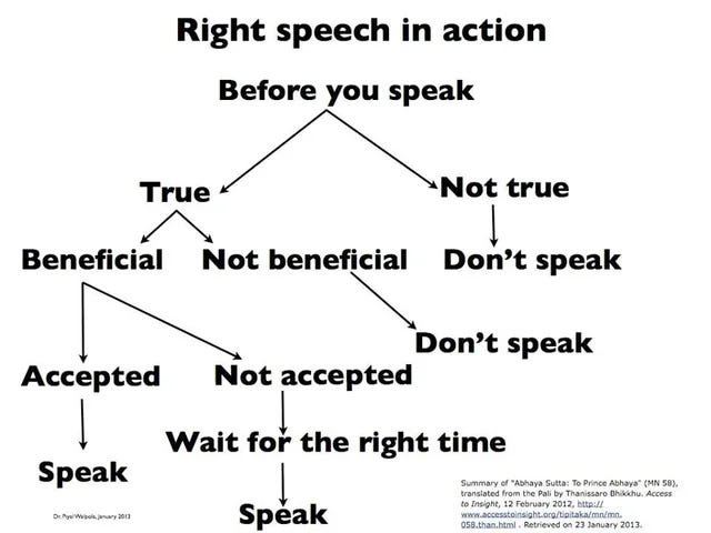 This is why it’s helpful to realize why one of the eight items mentioned in The Noble Eightfold Path (a path built upon groundedness) is a concept known as “skillful speech” (and why entire books can be written on that one topic alone… but here’s a short article form Ethan Nichtern if you’d like to dip your toes for a minute OR just check out this infographic I uncovered via google’n).